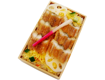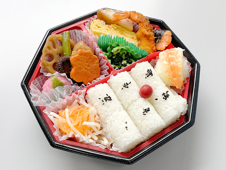 白飯、煮物(蓮根、紅葉豆腐、里芋他)、手毬寿司、玉子焼、鶏照焼、酢の物、桜餅、エビフライ