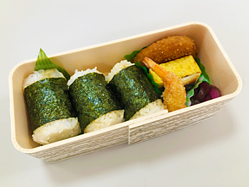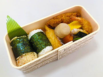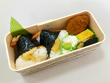 俵むすびと焼物、煮物、揚物がバランスよく入ったお弁当です。